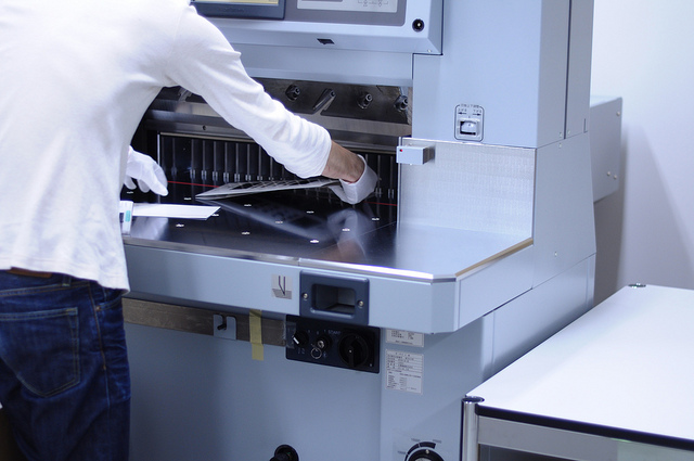 製本されたものをセットして、足下にあるスイッチで裁断の際にズレがでないよう押さえとなる機構を発動。